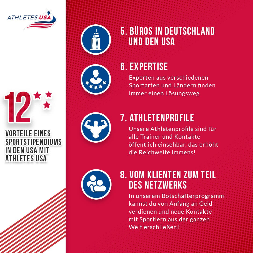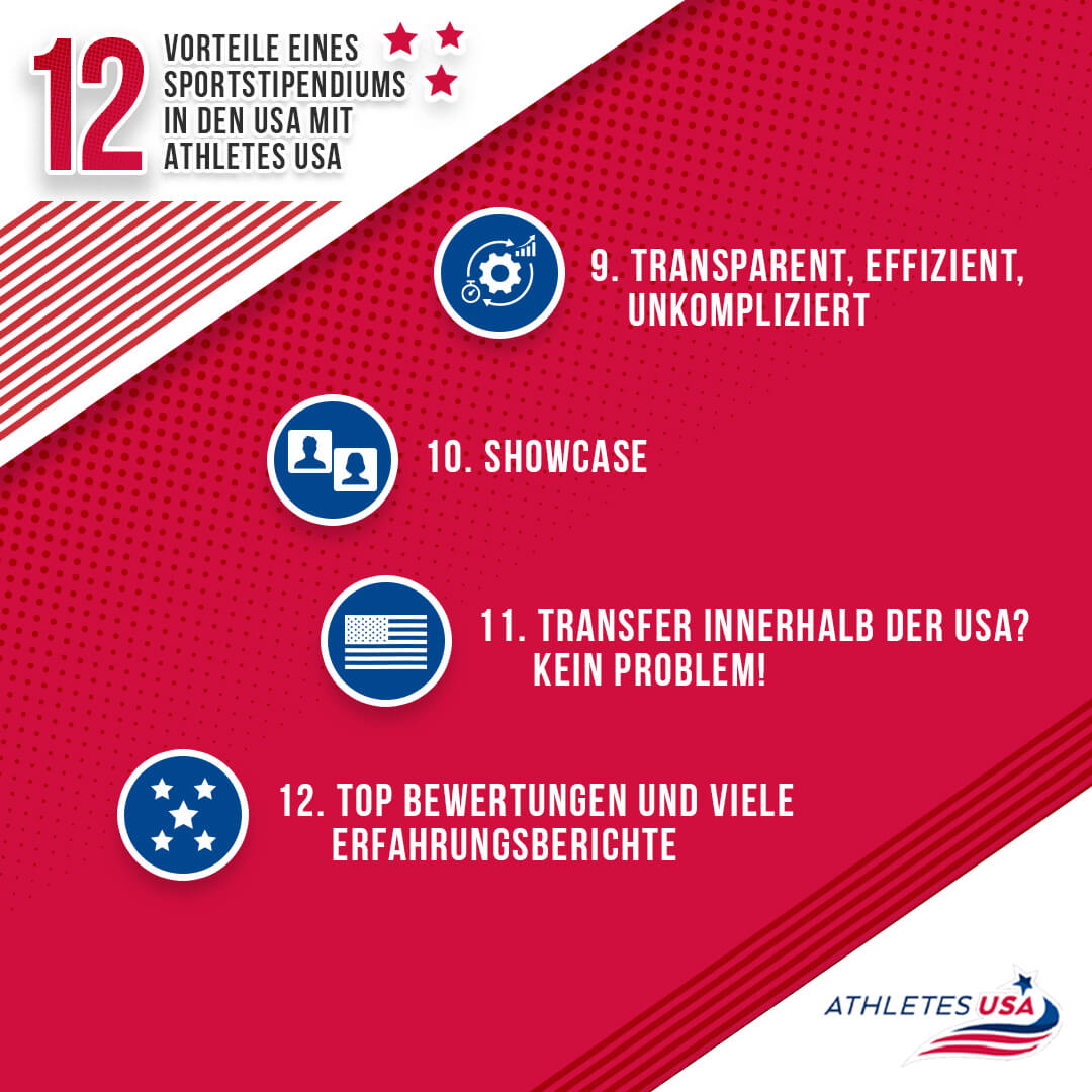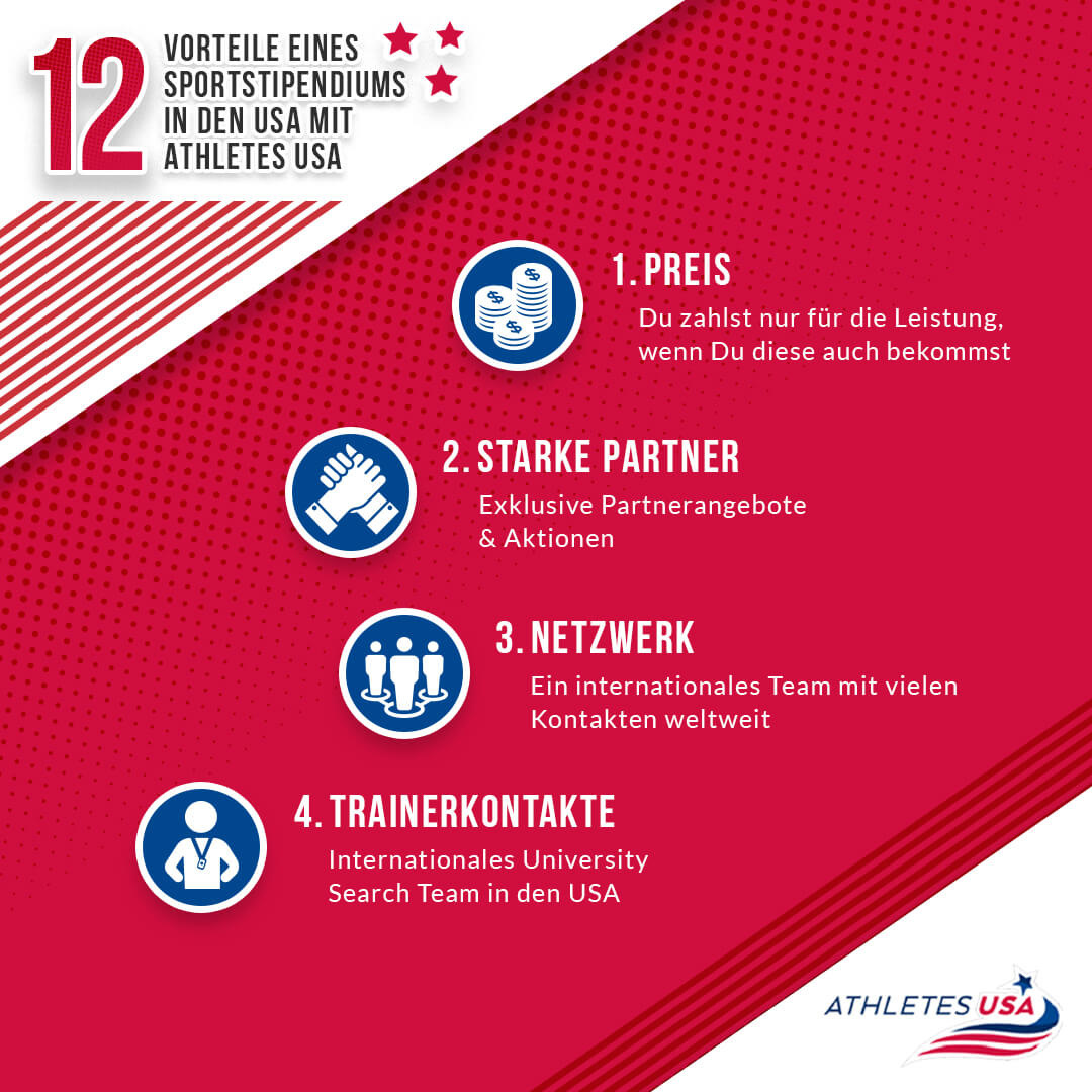 Dein Sportstipendium kann einen Wert von 250.000 USD im Laufe deiner Zeit in den USA übersteigen. Zusätzlich kann Dir Athletes USA auf dem Weg zu einem Sportstipendium in den USA oder Kanada aber noch viel mehr helfen. Hier sind die 12 wichtigsten Vorteile durch Athletes USA.